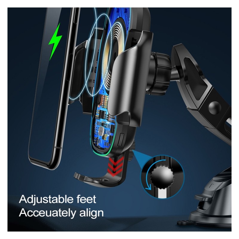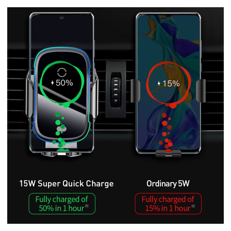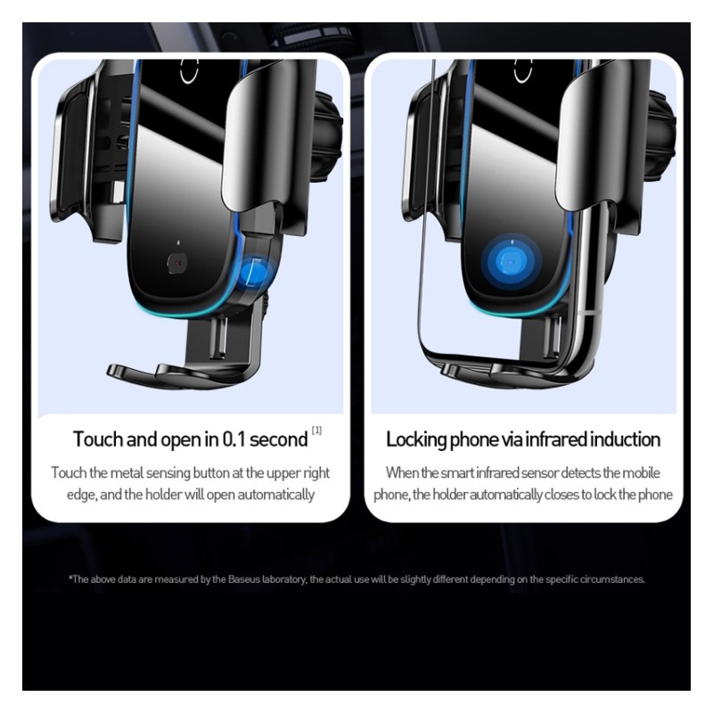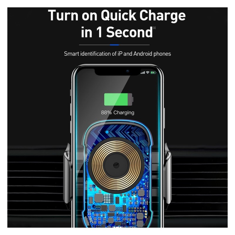 Univerzální držák do auta od výrobce Baseus, který v sobě má zabudovanou bezdrátovou nabíječku. Držák lze velice jednoduše připevnit na palubovou desku pomocí silné přísavky. Lze ho také nasadit na ventilační mřížku pomocí přiloženého nástavce. Nabíjecí výkon je až 15 W, z 0 na 50 % nabije přístroj za pouhých 30 minut. Výstup: 5 V/2 A, 9 V/1,67 A. Kloub držáku je otočný o 360 °.
