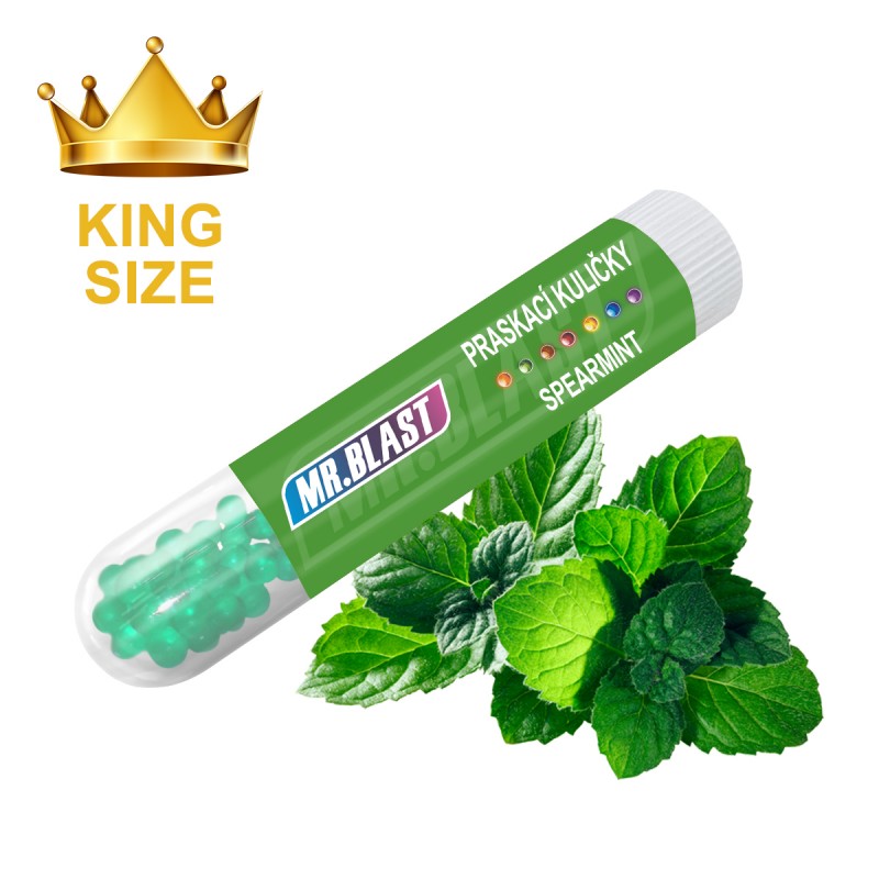 Balení oblíbených praskacích kuliček s příchutí SPEARMINT v královské velikosti. Oproti ostatním kuličkám jsou kuličky King size větší, a tak nejsou vhodné do slimek. Větší kuličky = více chuti a výraznější aroma. Toto balení je pro opravdové fajnšmekry!